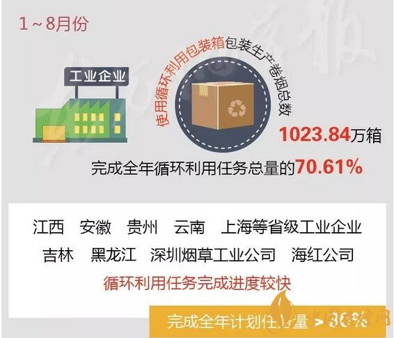 工業(yè)企業(yè)累計(jì)使用循環(huán)利用包裝箱包裝生產(chǎn)卷煙1023.84萬箱,完成全年循環(huán)利用任務(wù)總量的70.61%。其中,浙江、重慶、安徽、江蘇、福建、云南、北京等省級商業(yè)企業(yè)總體返還比例較高,返還率均超過100%;江西、安徽、貴州、云南、上海等省級工業(yè)企業(yè)及中國煙草實(shí)業(yè)發(fā)展中心所屬吉林、黑龍江、深圳煙草工業(yè)有限責(zé)任公司和海南紅塔卷煙有限責(zé)任公司循環(huán)利用任務(wù)完成進(jìn)度較快,已累計(jì)完成全年計(jì)劃任務(wù)量的80%以上。