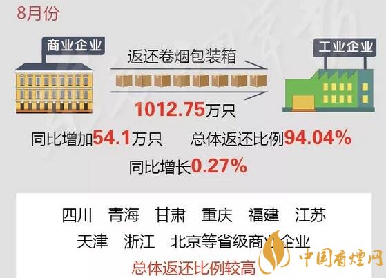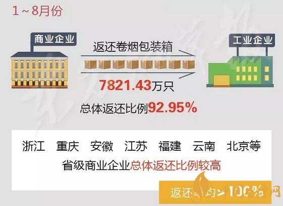 根據(jù)通報(bào),1至8月份,行業(yè)商業(yè)企業(yè)累計(jì)向工業(yè)企業(yè)返還卷煙包裝箱7821.43萬只,總體返還比例為92.95%;