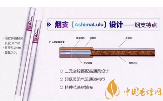 煙支Ashima Lulu,為纖細(xì)型,長(zhǎng)84mm,直徑5.4mm,重量只有0.5克。具有二元空腔匹配高透風(fēng)設(shè)計(jì)、超低阻氣流通道構(gòu)型、特種芯基材填充等特點(diǎn)。