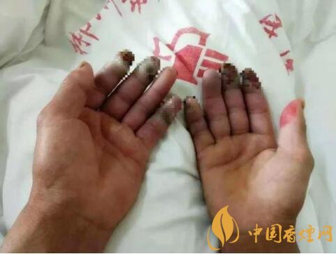 今年8月,谷某雙手手指開(kāi)始出現(xiàn)間歇性疼痛。起先,他還以為是痛風(fēng),沒(méi)太在意,只是在當(dāng)?shù)蒯t(yī)院配了些治痛風(fēng)的藥。兩個(gè)多月后,疼痛明顯加劇,晚上睡覺(jué)時(shí)特別疼,整夜整夜地疼,需要靠吃止痛藥才能入睡,慢慢手指遠(yuǎn)端出現(xiàn)發(fā)黑,患者家人這時(shí)很重視,帶患者跑了三家醫(yī)院,確診為"血栓閉塞性脈管炎"。入院前,止痛藥已經(jīng)完全起不了作用,整夜都不能睡,痛得大汗淋漓,一雙手,要時(shí)時(shí)刻刻泡在冷水里面,拿出來(lái)時(shí)要用嘴巴吹風(fēng),時(shí)時(shí)刻刻抖動(dòng)雙手,緩解疼痛,一副痛不欲生的樣子。