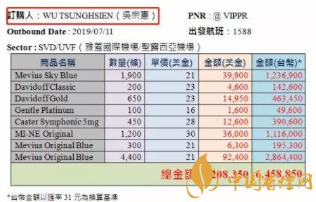 除此之外,黃國昌還貼出一張“訂購單”圖片,其中顯示“訂購”內(nèi)容為八種香煙,金額總計6458850元新臺幣,還標(biāo)注了航班、日期、機(jī)場等信息,而“訂購人”一欄還清楚寫著“吳宗憲”的大名。