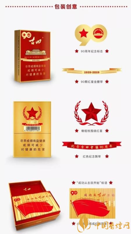 古田金中支90周年紀(jì)念版在包裝正面左上角有90周年紀(jì)念標(biāo)志,在煙包腰部位置有90顆紅星組成的金腰帶;在包裝背面有以橄欖枝圍繞的紅星和紅色紀(jì)念飄帶;打開煙包可以看見清晰的“成功從古田開始”的標(biāo)語(yǔ)和小盒側(cè)面組成的紅旗圖案。種種設(shè)計(jì),巧具匠心,輝映歷史。此時(shí)正值歲末年初元旦之際,古田金中支90周年紀(jì)念版是紅色卷煙中不可多得的禮贈(zèng)、過節(jié)佳選。
