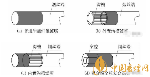 溝槽濾嘴:是一種由于特殊結構的溝槽純纖維紙包囊醋酸纖維絲束濾芯制成。簡單來說,就是在醋酸濾芯的外圍先包覆一層溝槽纖維素紙,然后包裹一層成形紙而成。溝槽纖維素紙的表面是通長的溝槽段或者是溝槽段和平坦段組合構成。其作用一方面可以有效減小吸阻提高通透感。另一方面增大煙氣與濾嘴的接觸的表面積,快速降低煙氣溫度和增加對煙氣有害物質的過濾和吸附。