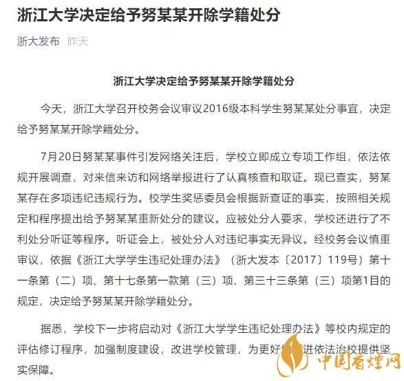 浙大表示,現(xiàn)已查實(shí),努某某存在多項(xiàng)違紀(jì)違規(guī)行為。浙大學(xué)生獎(jiǎng)懲委員會(huì)根據(jù)新查證的事實(shí),按照相關(guān)規(guī)定和程序提出給予努某某重新處分的建議。應(yīng)被處分人要求,學(xué)校還進(jìn)行了不利處分聽(tīng)證等程序。聽(tīng)證會(huì)上,被處分人對(duì)違紀(jì)事實(shí)無(wú)異議。經(jīng)浙江大學(xué)校務(wù)會(huì)議慎重審議,依據(jù)《浙江大學(xué)學(xué)生違紀(jì)處理辦法》(浙大發(fā)本〔2017〕119號(hào))相關(guān)規(guī)定,決定給予努某某開(kāi)除學(xué)籍處分。
