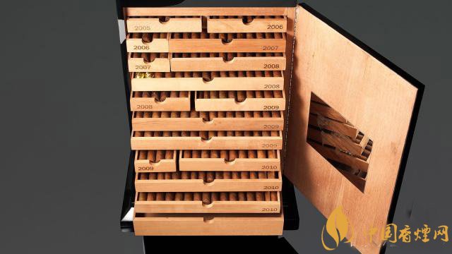 雪茄柜是一個(gè)木制烤漆立柜,方方正正的。主體是黑色,雪茄盒上裝飾著一張世界地圖,雪茄系列所代表的任何國(guó)家/地區(qū)都會(huì)在柜子表面上發(fā)出黑暗的光芒。打開柜子,里面是不同年份的抽屜,抽屜里面裝著這個(gè)年份的地區(qū)限量版雪茄。