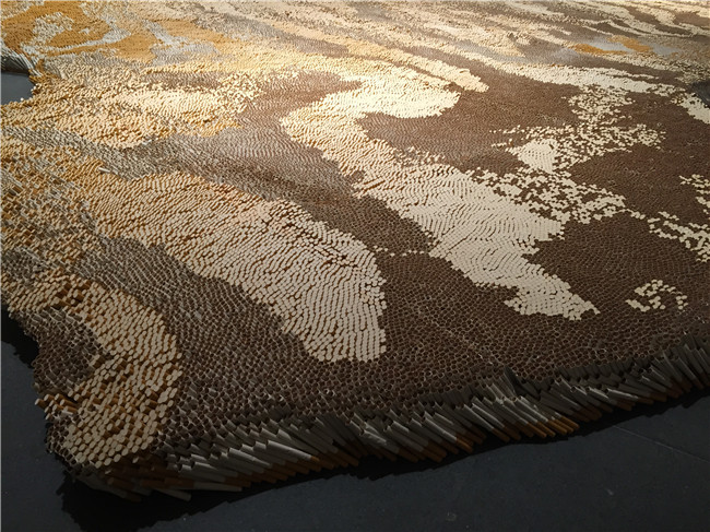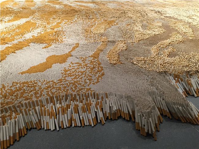這件巨大而厚實(shí)的“虎皮地毯”鋪陳,是由50萬(wàn)支重達(dá)440磅的香煙按照特殊的排列組成的驚人之作。為了突出全球貿(mào)易、包裝和人們是如何被致命的吸煙習(xí)慣所誘惑,56歲的徐冰經(jīng)過(guò)十年探索花上十年的時(shí)間去制作……,最終創(chuàng)作出此作品。