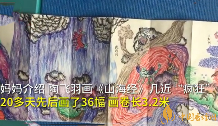 重慶10歲的陶飛羽暑期萌發(fā)了繪畫《山海經(jīng)》故事的想法。媽媽介紹,陶飛羽畫《山海經(jīng)》幾近“瘋狂”,20多天先后畫了36幅,畫卷長(zhǎng)3.2米。除了畫《山海經(jīng)》的奇花異獸和奇特風(fēng)貌,陶飛羽還嘗試?yán)L神話故事。