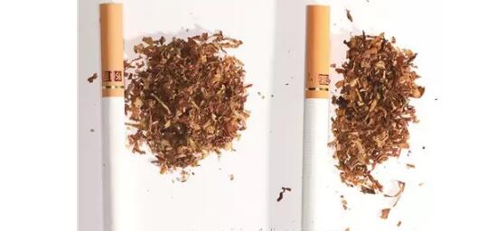 假煙煙支過濾嘴較短,長度約為20mm,制絲工藝粗糙,色澤發(fā)暗無光澤、煙絲中含碎末較多,大量梗絲未經(jīng)過膨脹處理,無造紙法再造煙葉,與真品特征存在明顯差異。