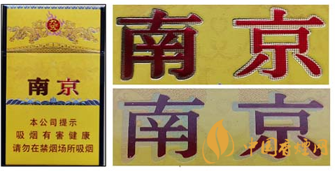 假冒卷煙:該款假冒卷煙南京字體邊緣金色輪廓線和筆畫內(nèi)無小圓點(diǎn),字體筆畫顏色暗淡,燙金套印有偏差。圖3上真下假