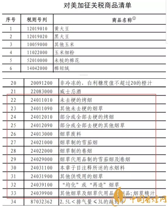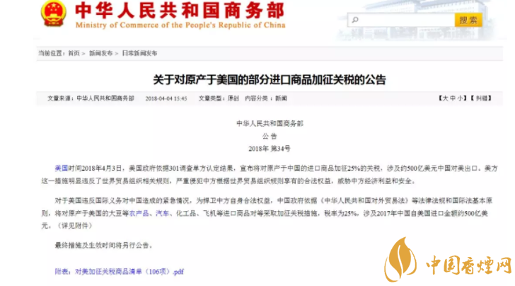 隨著中美貿易戰(zhàn)的不斷升級,從受限清單的第一頁,煙民們酒看到了煙草生產過程中涉及的未去??緹?、其他去梗煙草、煙草制的雪茄煙、煙草制的卷煙等產品。為捍衛(wèi)中方自身合法權益,中國政府依據《中華人民共和國對外貿易法》等法律法規(guī)和國際法基本原則,對原產于美國的進口商品對等采取加征關稅措施,稅率為25%,涉及2017年中國自美國進口金額約500億美元。