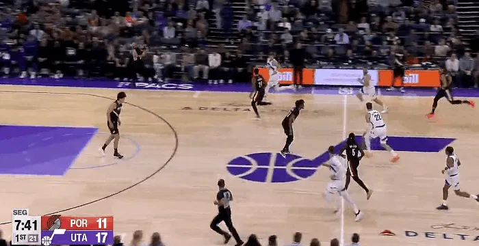 第一節(jié)比賽中,補(bǔ)上暴扣楊瀚森還剩8分鐘替補(bǔ)上場(chǎng),場(chǎng)凱凱斯勒空接暴扣打停開拓者??战娱_拓