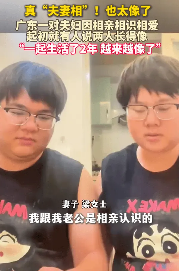 妻子梁女士表示,自己跟老公是相親認識,剛開始的時候就有很多人說他們兩個長得很像。一起生活了兩年,結(jié)果越來越像了。