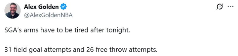 “過了今晚,SGA的手臂肯定累壞了。運動戰(zhàn)他出手31次,外加獲得26次罰球?!?/p>