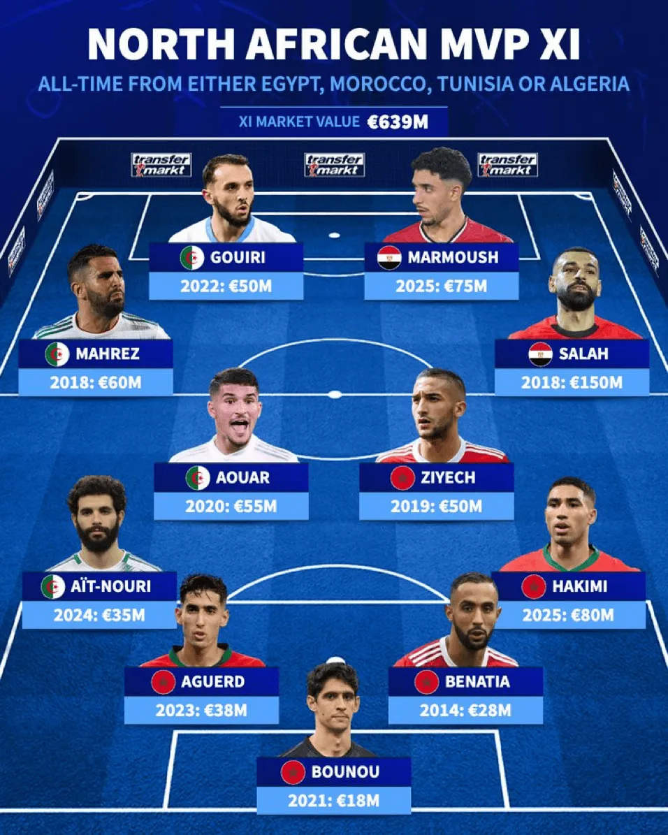 虎撲10月15日訊 德國轉(zhuǎn)會市場盤點了足壇歷史上身價最高的北非球員,并組成了一套最佳陣容,詳情如下: