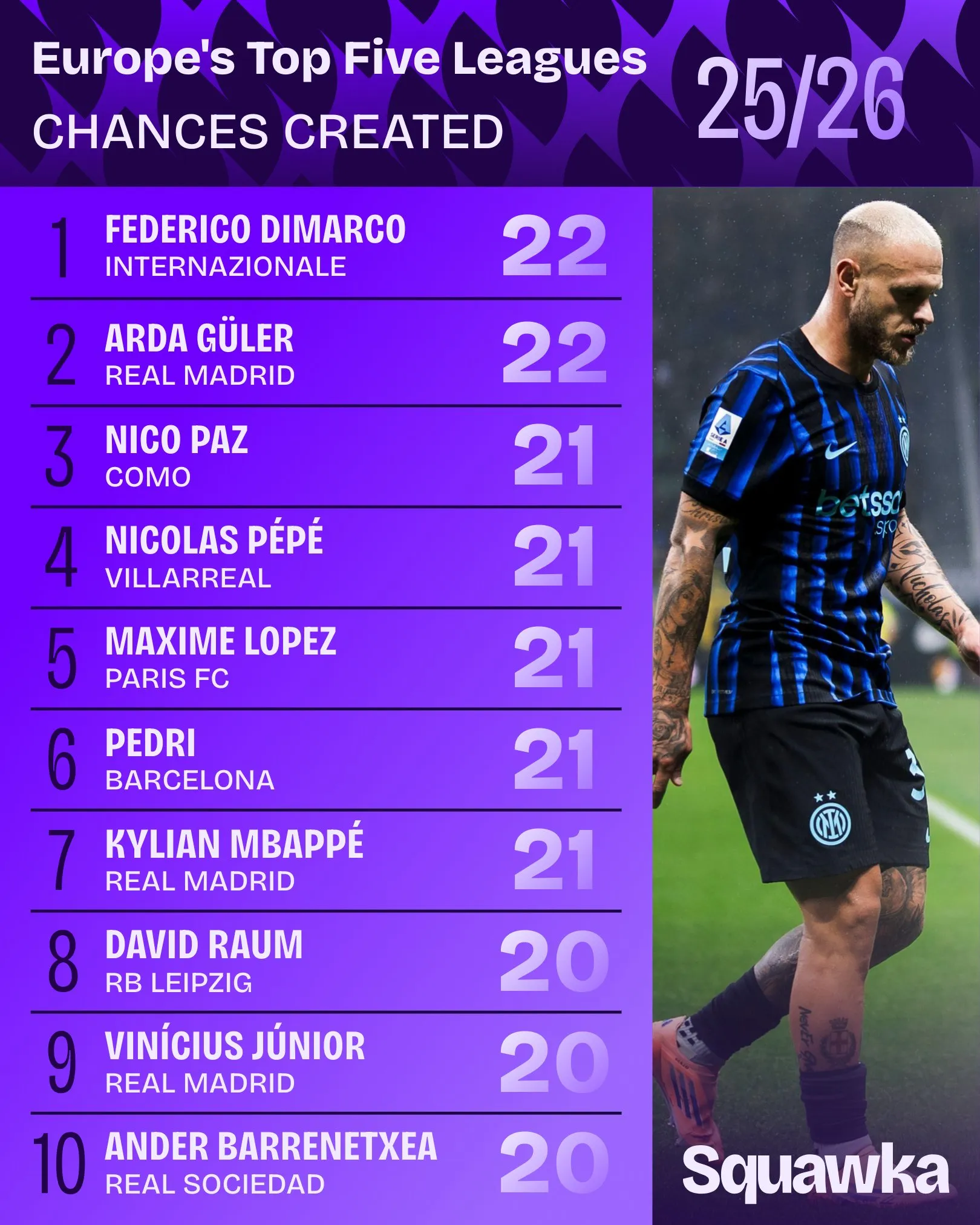 虎撲10月16日訊 Squawka數(shù)據(jù)統(tǒng)計本賽季至今五大聯(lián)賽創(chuàng)造機會榜,迪馬爾科與居萊爾22次并列第一。迪馬的球