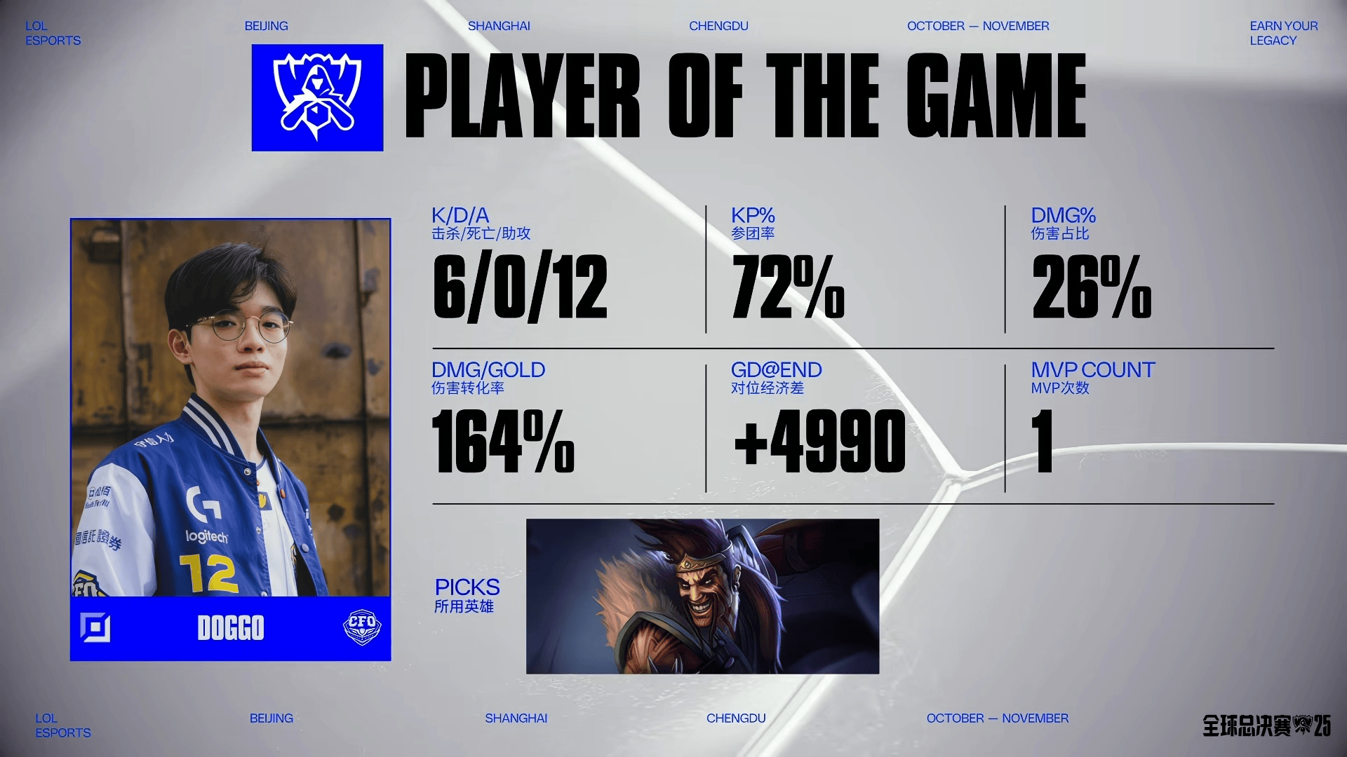 虎撲10月16日訊 在剛剛結(jié)束的S15瑞士輪的比賽中,Doggo德萊文砍下6/0/12的戰(zhàn)績陣戰(zhàn)績,拿下CFO對陣T1全場MVP
