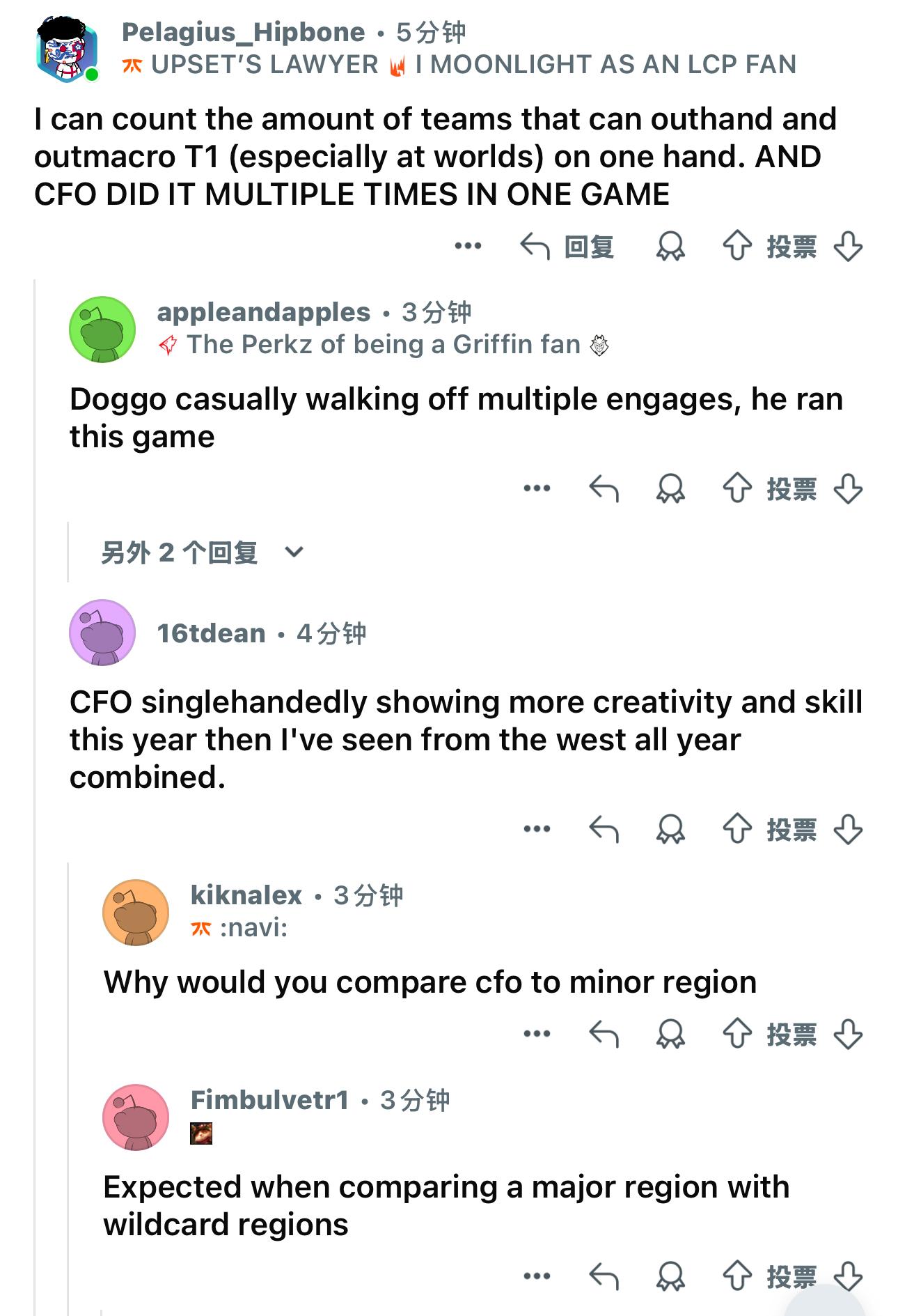 虎撲10月16日訊 CFO戰(zhàn)勝T1引發(fā)了Reddit熱議,部分內(nèi)容如下: