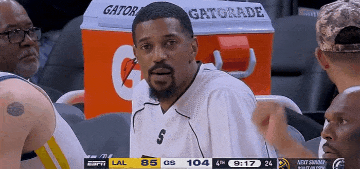 第四節(jié)比賽,復(fù)何梅爾頓身著便裝現(xiàn)身勇士替補(bǔ)席。頓身