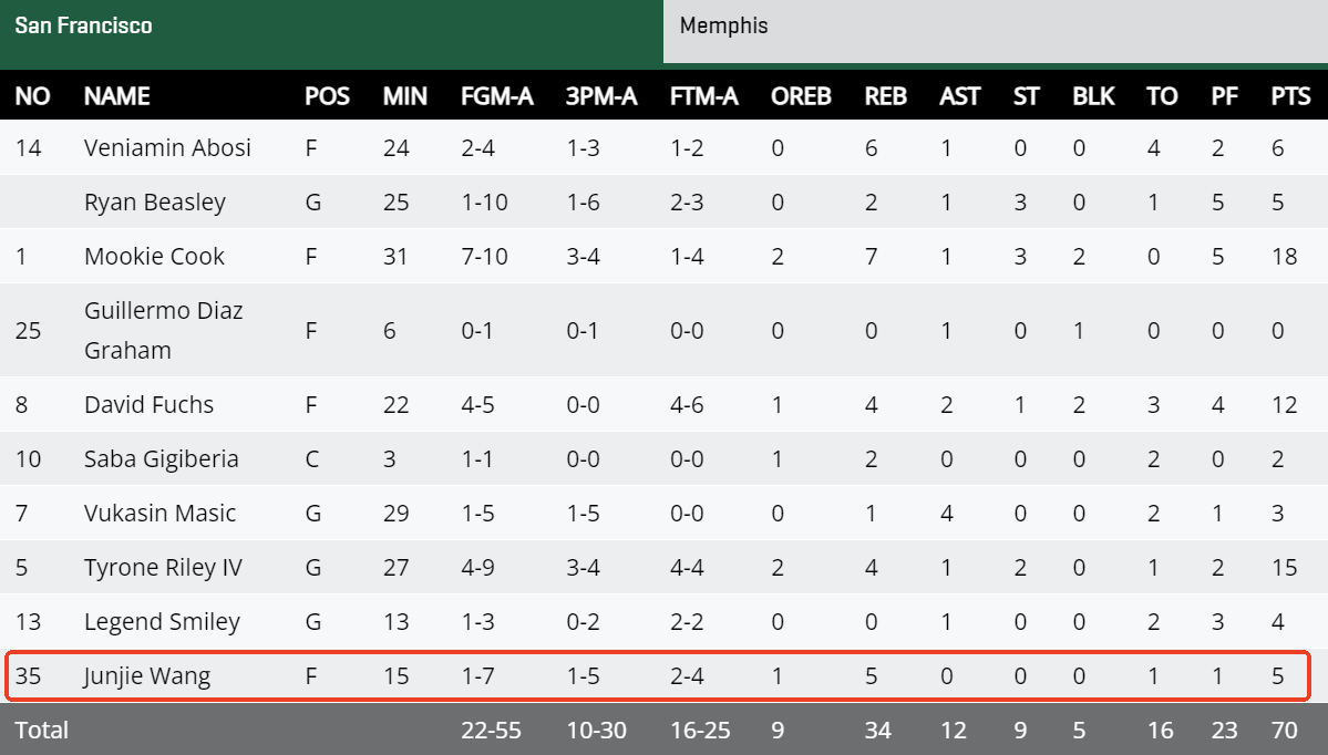 [流言板]NCAA常規(guī)賽:王俊杰5分5板,板N板舊舊金山70-76不敵孟菲斯大學由虎撲籃球資訊 發(fā)表在CBA專區(qū) https://bbs.hupu.com/cba