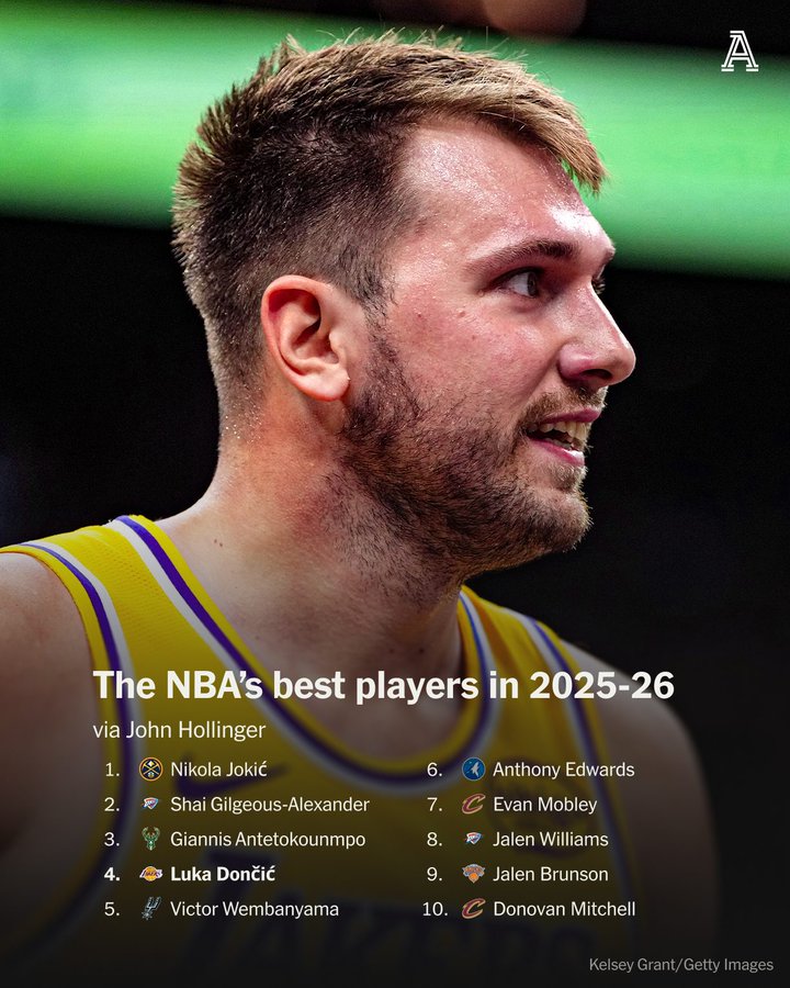 虎撲10月16日訊 今日,The Athletic更新社交媒體,曬出TA記者John Hollinger列出的2025-26賽季十大球星。