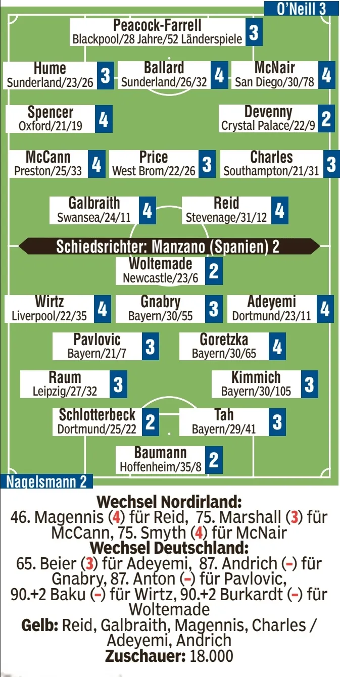 來(lái)源:X虎撲10月14日訊 世界杯歐洲區(qū)預(yù)選賽,德國(guó)1-0擊敗北愛(ài)爾蘭。賽后,德國(guó)媒體《圖片報(bào)》為兩隊(duì)球員的表現(xiàn)進(jìn)行了評(píng)分。其中,德國(guó)隊(duì)方面,鮑曼、施洛特貝克、沃爾特馬德拿到2分好評(píng),維爾茨、格雷茨卡、阿德耶米則收獲4分差評(píng)。
