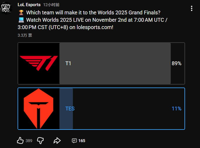 其中,投票認為T1獲勝的官方占比89%,認為TES獲勝的發(fā)布僅占比11%。