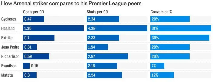 然而,圍繞這位瑞典前鋒的氛圍卻不再那么狂熱。事實(shí)上,哲凱賴什正迅速成為酋長(zhǎng)球場(chǎng)和嘈雜的社交媒體上阿森納球迷爭(zhēng)論的主要焦點(diǎn)。