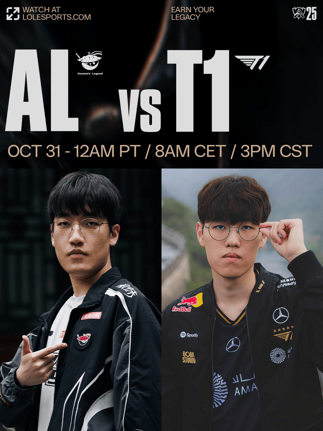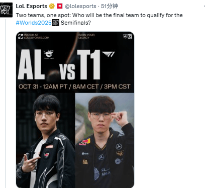 虎撲10月30日訊 LOL官推發(fā)布AL對(duì)陣T1賽前海報(bào):兩支隊(duì)伍一個(gè)名額,誰(shuí)能晉級(jí)半決賽?
