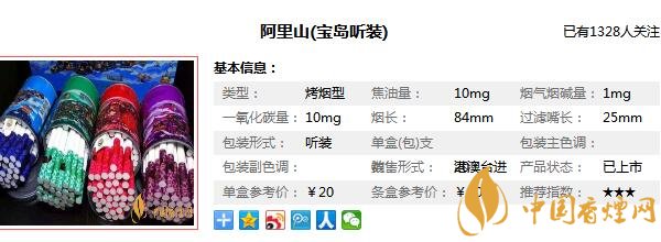 這款阿里山1905鐵罐裝香煙其實就是,阿里山(寶島聽裝),這款香煙作為“阿里山”旗下又一款獨具特色的臺灣高檔烤煙型卷煙,無論從它的外觀還是它的特色來講,這款香煙都有著它的獨到之處,那么在介紹阿里山香煙1905鐵罐價格圖片之前,先來看一看這款阿里山1905多少錢一罐,這款香煙的參考價為20元/罐。