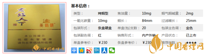 黃鶴樓君臨天下2300元/條,230元/包。香氣均勻和諧,外觀精致,因為價格較高,此前一再被網(wǎng)友拿來炒作,以致于現(xiàn)在在國內(nèi)都很少有這款煙流通,外銷占比較大。黃鶴樓品種較多,口感方面也是因人而異,具體細節(jié)還是看個人習(xí)慣。