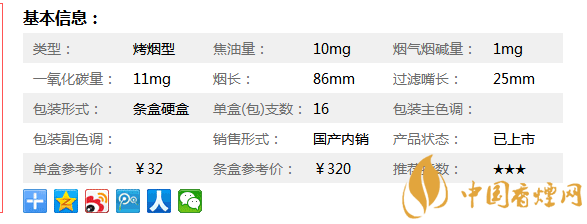 | 類型 :烤煙型 | 焦油量 :10mg | 煙氣煙堿量 :1mg | 一氧化碳量 :11mg |