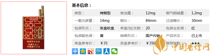 | 類型 :烤煙型 | 焦油量 :12mg | 煙氣煙堿量 :1.2mg | 一氧化碳量 :14mg |