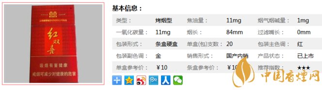 “百順”紅雙喜運用了特殊的保潤技術,確保煙香和水份不會隨煙包打開而過快流失,燃燒速度不快,煙支也不易折斷。下面我們一起來看紅雙喜硬百順香煙的參數(shù)信息:焦油量:11mg 煙堿量:1mg 一氧化碳量:11mg