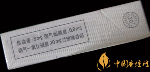 | 類型 :烤煙型 | 焦油量 :8mg | 煙氣煙堿量 :0.8mg | 一氧化碳量 :10mg |