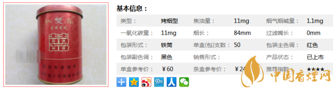 紅雙喜吉祥龍鳳一條四罐,一罐50支,煙長84mm,于2014年上市,這款煙送禮很合適,抽起來很絲滑。下面我們一起來看紅雙喜吉祥龍鳳的參數(shù)信息:焦油量:11mg 煙堿量:1.1mg 一氧化碳量:11mg