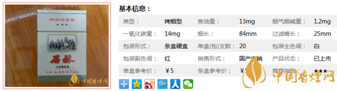 石林白香煙煙長84mm,過濾嘴長25mm,采用高難度的凸、平燙結合的燙金技術;多工序膠凹印相結合,增加了商標的制作難度;采用了具有較強防偽功能的潛影壓紋新技術,從不同方向看,可見“石林”和“STONE FOREST”英文。下面我們一起來看石林白的參數(shù)信息:焦油量:13mg 煙堿量:1.2mg 一氧化碳量:14mg.
