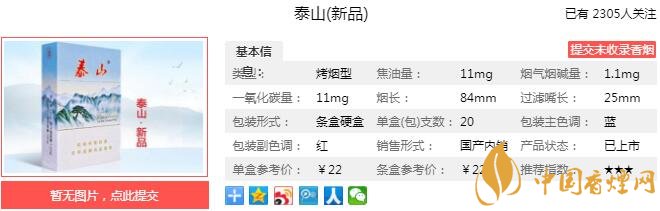 泰山新品精選優(yōu)質(zhì)進口煙葉,采用純天然香精香料,香氣清雅濃馥、豐滿、諧調(diào)、吸味純正、口感細膩、余味純凈舒適,“清新自然、至尊泰山”是卷煙中的高檔精品。下面一起來看下泰山新品的具體參數(shù):一盒20支,煙長84mm,焦油量11mg,煙堿量1.1mg,一氧化碳量11mg。