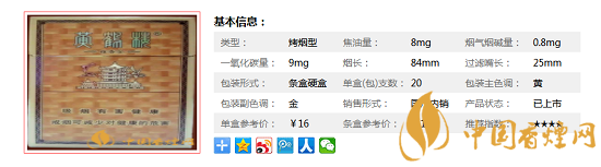 | 類型 :烤煙型 | 焦油量 :12mg | 煙氣煙堿量 :1.1mg | 一氧化碳量 :13mg |