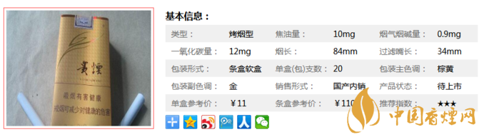 | 類型 :烤煙型 | 焦油量 :10mg | 煙氣煙堿量 :0.9mg | 一氧化碳量 :12mg |