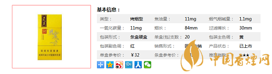 | 類(lèi)型 :烤煙型 | 焦油量 :11mg | 煙氣煙堿量 :1.1mg | 一氧化碳量 :10mg |