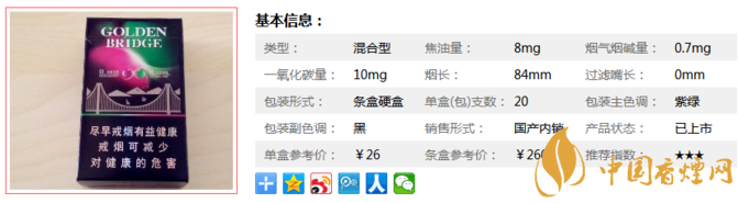 | 煙長(zhǎng):84mm | 過(guò)濾嘴長(zhǎng):25mm | 包裝形式:條盒硬盒 | 單盒(包)支數(shù):20 |