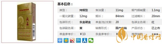 | 類(lèi)型 :烤煙型 | 焦油量 :11mg | 煙氣煙堿量 :1.1mg | 一氧化碳量 :12mg |