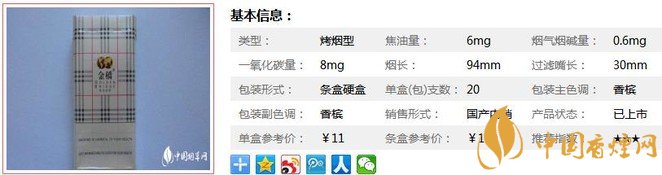 | 類型 :烤煙型 | 焦油量 :6mg | 煙氣煙堿量 :0.6mg | 一氧化碳量 :8mg |