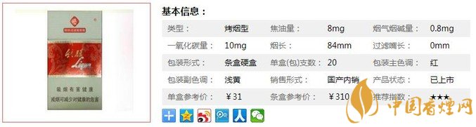 | 類型 :烤煙型 | 焦油量 :8mg | 煙氣煙堿量 :0.8mg | 一氧化碳量 :10mg |