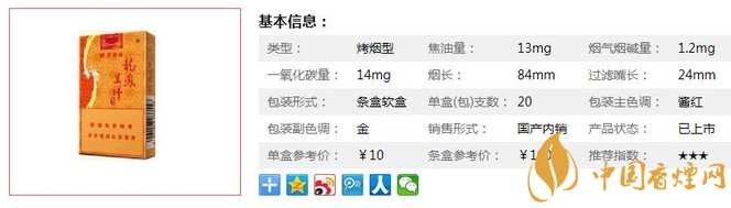 | 類型 :烤煙型 | 焦油量 :13mg | 煙氣煙堿量 :1.2mg | 一氧化碳量 :14mg |