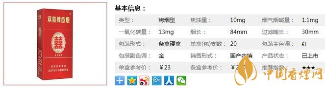 雙喜硬世紀(jì)經(jīng)典煙支長(zhǎng)84mm,產(chǎn)品精選美國(guó)、津巴布韋、贊比亞等國(guó)際優(yōu)質(zhì)煙葉原料和云南、貴州、四川、湖南等國(guó)內(nèi)知名產(chǎn)區(qū)的上等煙葉。香醇度很高的煙氣層次分明、協(xié)調(diào)、成團(tuán)性也很好,感受舒適。下面我們一起來(lái)看雙喜硬世紀(jì)經(jīng)典的參數(shù)信息:焦油量:10mg. 煙堿量:1.1mg. 一氧化碳量:13mg.