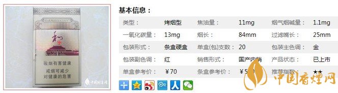 | 類型 :烤煙型 | 焦油量 :11mg | 煙氣煙堿量 :1.1mg | 一氧化碳量 :13mg |