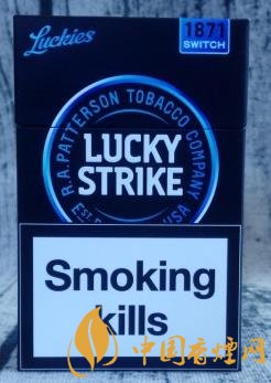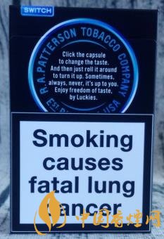 藍(lán)色,本就屬于神秘的色調(diào)。二者結(jié)合起來,帶來的視覺感,無疑更加強(qiáng)烈。撫摸煙盒的六面體,觀賞著黑藍(lán)相融的色調(diào),不失為一種雅趣。圓圈中的LUCKY STRIKE,撫摸起來凹凸感很明顯。翻蓋處1871下方的SWITCH,意為“轉(zhuǎn)變、轉(zhuǎn)換”,也就是指因?yàn)檫^濾嘴內(nèi)置爆珠,從而改變煙的味道。這款歐盟版的煙盒正面上方,沒有印制CLICK(捏破)字樣及爆珠標(biāo)識(shí),煙盒底部和內(nèi)襯錫紙上則有印制。