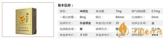 | 類型 :烤煙型 | 焦油量 :7mg | 煙氣煙堿量 :0.7mg | 一氧化碳量 :8mg |