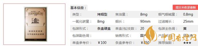 | 類型 :烤煙型 | 焦油量 :8mg | 煙氣煙堿量 :0.8mg | 一氧化碳量 :8mg |